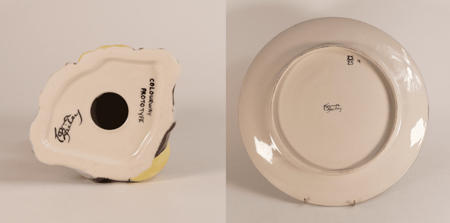 Lorna Bailey colourway Fireside Ratcatcher prototype which went into limited edition of 75 (August 2004) and a Lorna Bailey charger, limited edition of 25 – both signed in black