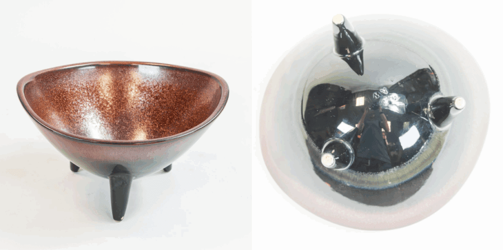 The final example of a rare Unique ware Queensware in this auction is a tri-footed bowl, with a ruby, black and grey crystalline glaze, c1960, with impressed and printed initials. There are many more lots of Unique ware to be seen in the catalogue.