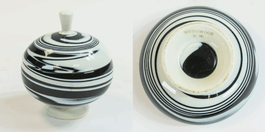 This is a rare Unique ware lidded Queensware bowl and cover with marbled/agate black and white glaze. It is c1960 with impressed & printed initials.