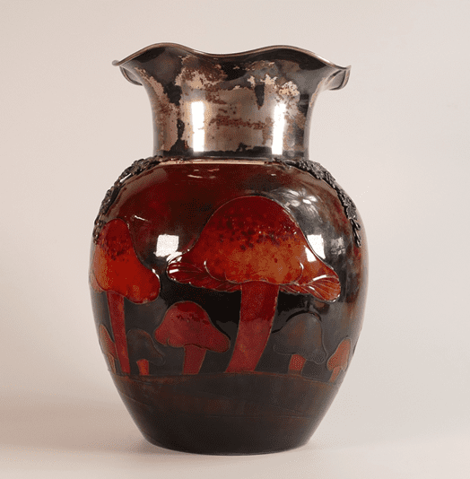 The William Moorcroft Flambe Ginger Jar in the Claremont design, c1920, with original Sterling Silver mounts by Gorham Mfg. Co., was certainly a flame in the auction, reaching an impressive £3,200. Its unusual design and the striking flambe glaze added a unique spice to the auction, mush-room for only one lucky bidder to walk away with this rare piece!