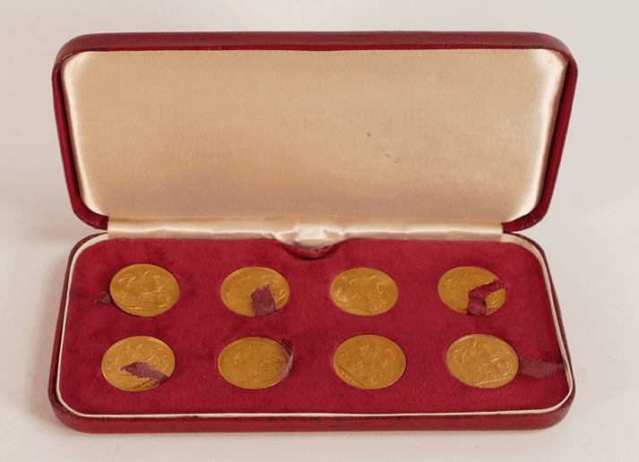 A box of eight full sovereigns, comprising three Edward VII and five George V sovereigns, with varying dates, achieved a superb total hammer price of £3,200. This lot certainly offered a golden opportunity for those looking to add to their collection.