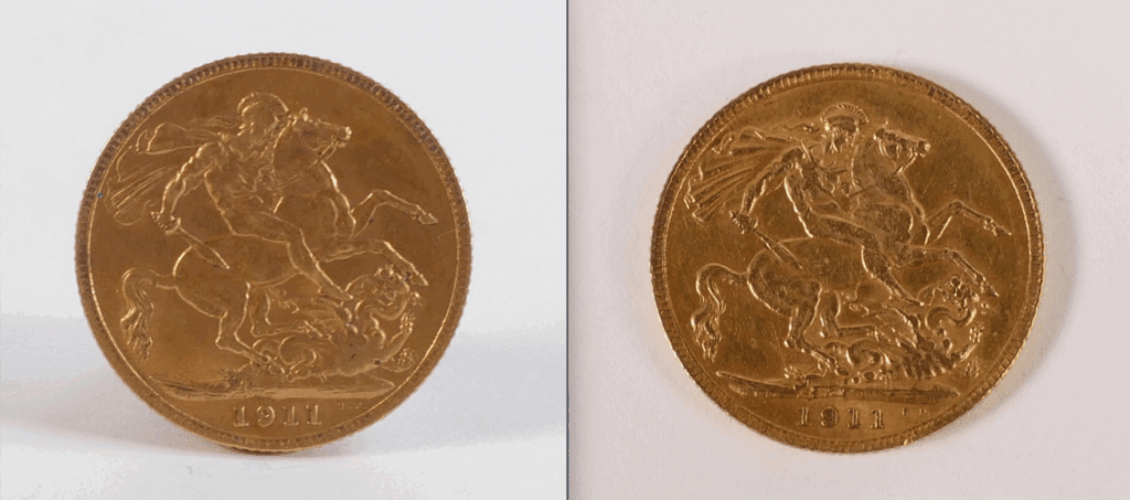 Another example, this George V full gold sovereign dated 1911 sold for £340 in March 2024 (left), and £740 in October 2025 (right), a 118% increase in just a year and a half