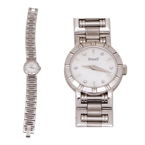 18ct white gold PIAGET ladies wrist watch and 18ct white gold Piaget bracelet, wearable length 16cm, a spare link is also included so length can be increased slightly. 52.4g (excluding weight of spare link) Sold for £3575 in Our November Fine Art & Specialist Jewellery Sale 2025